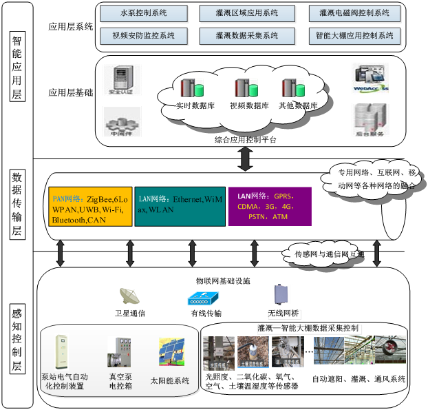 智能節(jié)水灌溉系統(tǒng)采用物聯(lián)網(wǎng)的三層架構(gòu),分為感知控制層、數(shù)據(jù)傳輸層、智能應(yīng)用層,并結(jié)合視頻監(jiān)控系統(tǒng)對農(nóng)作物生長情況的遠(yuǎn)程監(jiān)視,實(shí)時(shí)對分灌區(qū)環(huán)境參數(shù)的檢測和環(huán)境調(diào)整機(jī)構(gòu)的控制。