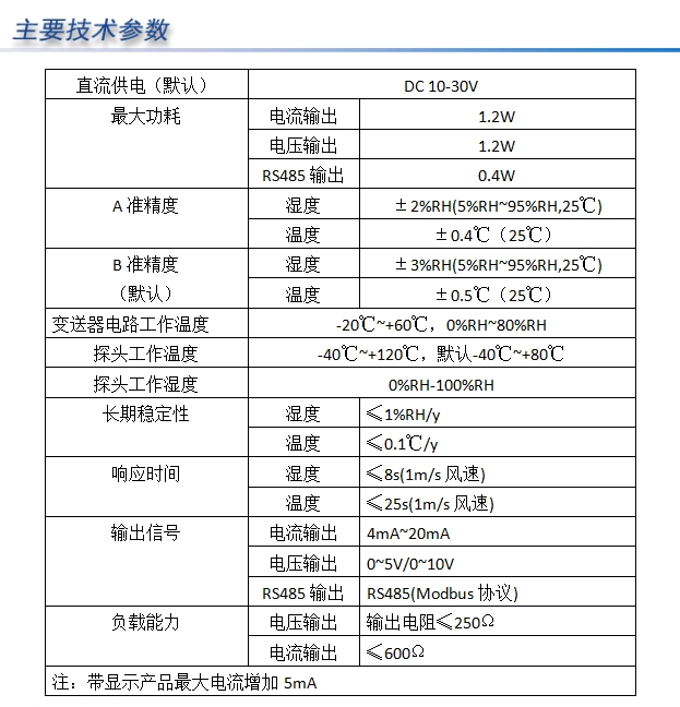 本溫濕度變送器采用外置防水溫濕度傳感器,溫濕度傳感器的PE濾芯防塵效果明顯。本公司獨(dú)有的防水處理工藝徹底的解決了溫濕度傳感器凝露狀態(tài)壽命短的問題。本溫濕度傳感器即使帶電狀態(tài)放入水中長時(shí)間浸泡也不會(huì)損壞。由于透氣孔徑微小造成檢測靈敏度降低,此種溫濕度傳感器不適合高靈敏度場合。輸出信號(hào)類型分為RS485\4-20mA\0-5V\0-10V等。詳見選型表。