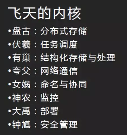 剛才我說阿里云是“起名驅動型的公司”,你看看這幫瘋子給飛天內部模塊的命名,就知道他們心里在想什么了: