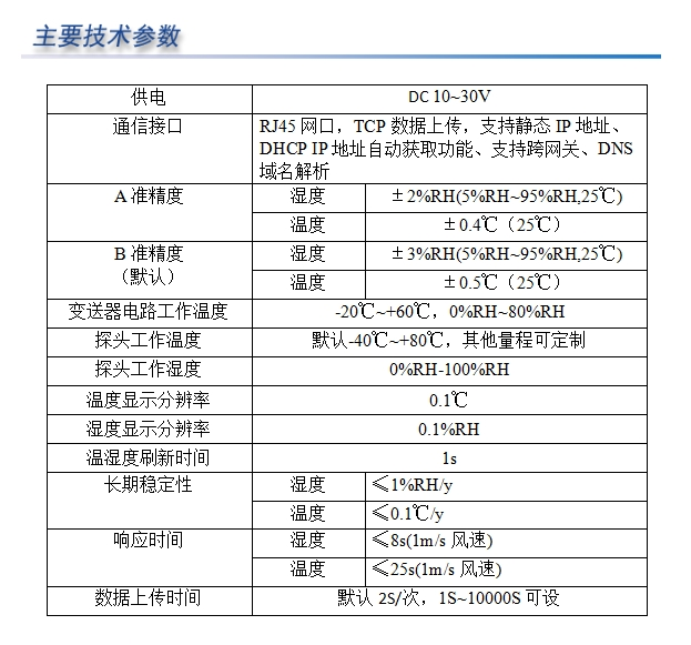 產品是工業級以太網型溫濕度變送器,可采集溫濕度數據并通過以太網方式上傳到服務器。本系列產品充分利用已架設好的以太網通訊網絡實現遠距離的數據采集和傳輸,實現溫濕度數據的集中監控。可大大減少施工量,提高施工效率和維護成本。