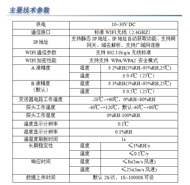本WIFI溫濕度變送器采用瑞士進口原裝高品質溫濕度測量單元,具有測量精度高,抗干擾能力強等特點,保證了產品的優異測量性能。