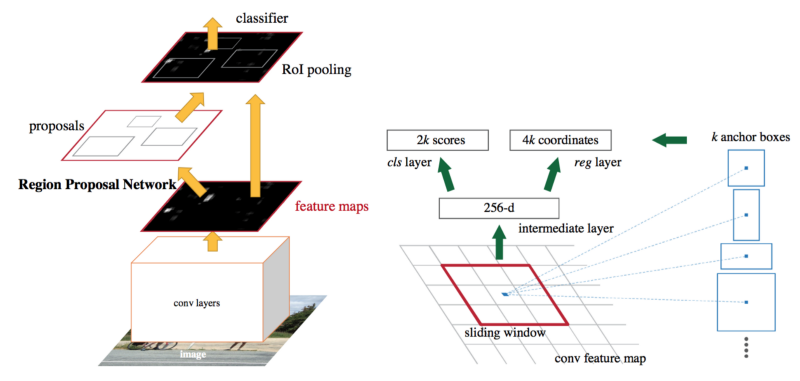在兩階段檢測器中,我們自然有兩個網絡:一個框提議網絡和一個分類網絡。框提議網絡得到了邊界框的坐標,它認為目標在這里的可能性很大;再次提醒,這些坐標都是相對于錨框的。然后,分類網絡獲取每個邊界框并對其中的潛在物體進行分類。