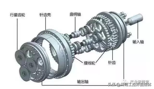RV減速器:是少齒差嚙合,但相對于諧波減速器,RV減速器通常用的是擺線針輪,RV減速器由擺線針輪和行星支架組成。相比諧波減速器,RV減速器的關鍵在于加工工藝和裝配工藝。RV減速器具有更高的疲勞強度、剛度和壽命,不像諧波傳動那樣隨著使用時間增長,運動精度會顯著降低,其缺點是重量重,外形尺寸較大。RV減速器用于轉矩大的機器人腿部腰部和肘部三個關節(jié),負載大的工業(yè)機器人,一二三軸都是用RV減速器。