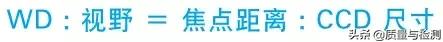 WD 和視野的大小由鏡頭的焦點距離和 CCD 的尺寸來決定。例如:焦點距離為 16 mm 鏡頭、CCD 尺寸 3.6 mm 時,如果想把視野設為 45 mm,則 WD 變為 200 mm。