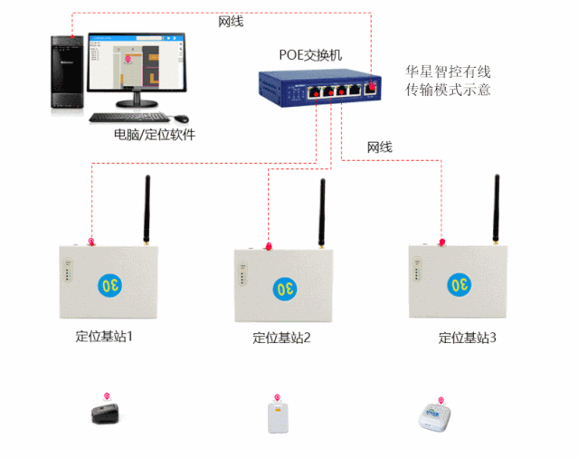 如下圖所示,UWB定位系統主要由三部分組成,定位標簽(信號發射源),定位基站(信號接收),客戶端軟件。