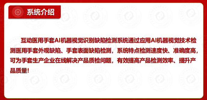 互動醫用手套AI機器視覺識別缺陷檢測系統通過應用AI機器視覺技術檢測醫用手套外觀缺陷、手套表面缺陷檢測,系統特點檢測速度快、準確度高,可為手套生產企業在線解決產品質檢問題,有效提高產品檢測效率、提升產品質量!