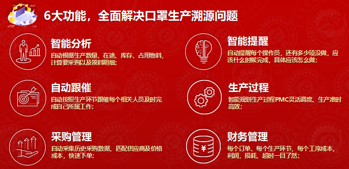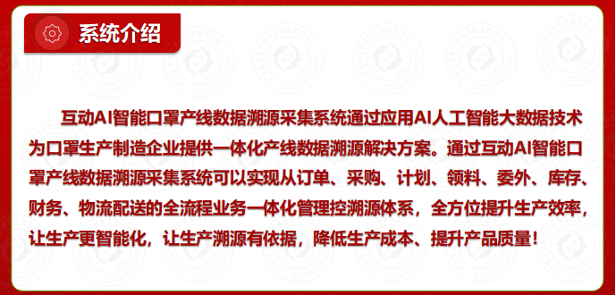 互動AI智能口罩產線數據溯源采集系統通過應用AI人工智能大數據技術為口罩生產制造企業提供一體化產線數據溯源解決方案。通過互動AI智能口罩產線數據溯源采集系統可以實現從訂單、采購、計劃、領料、委外、庫存、財務、物流配送的全流程業務一體化管理控溯源體系,全方位提升生產效率,讓生產更智能化,讓生產溯源有依據,降低生產成本、提升產品質量!