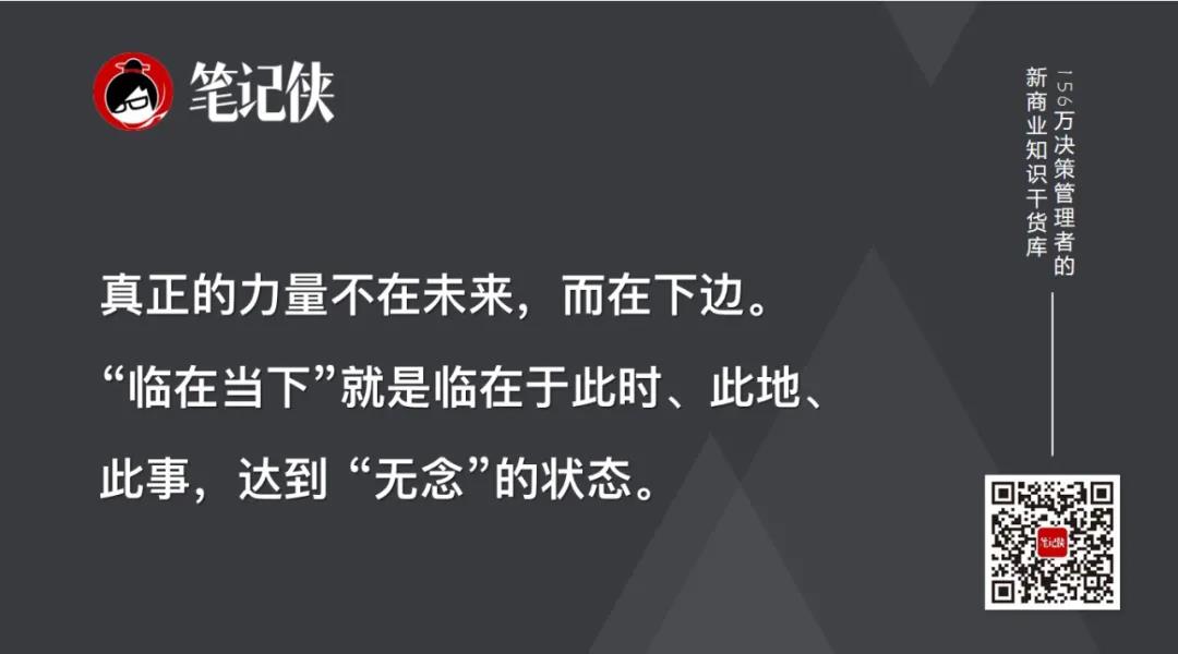 今天我們基本上都在時間的水平線上奔跑,追求更多更快,幾乎很少有人告訴你,真正的力量不在未來,而在下邊,“臨在當下”這四個字是一個重要的方法論。