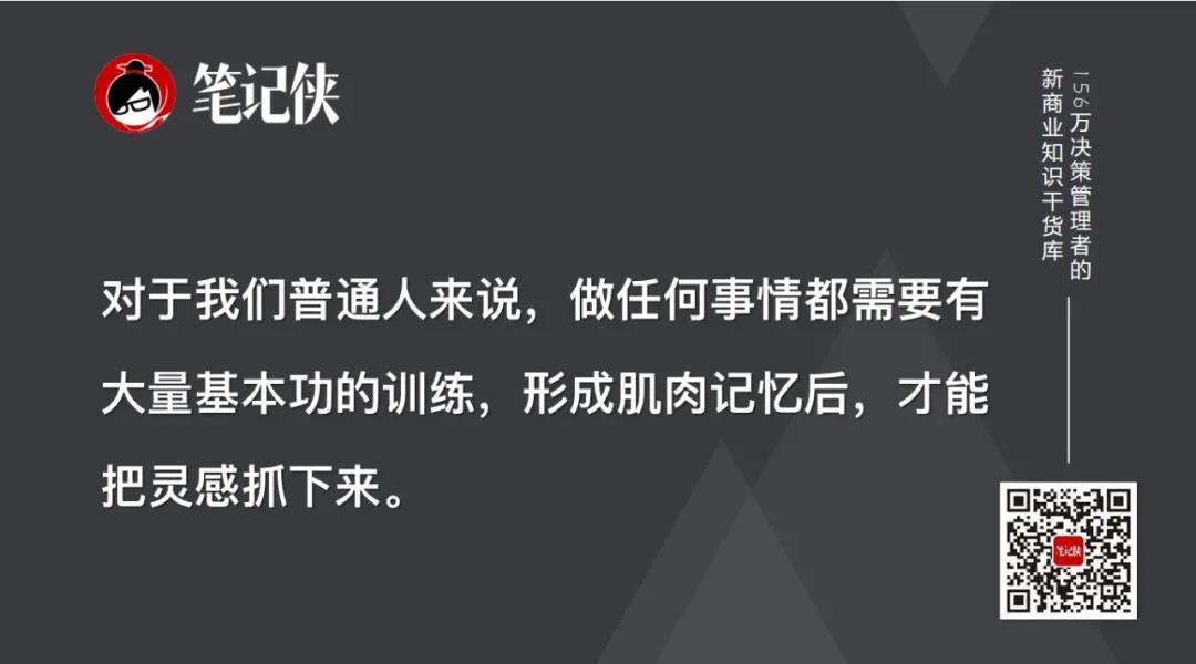 當然,對于我們普通人來說,做任何事情都需要有大量基本功的訓練,形成肌肉記憶后,才能把靈感抓下來。