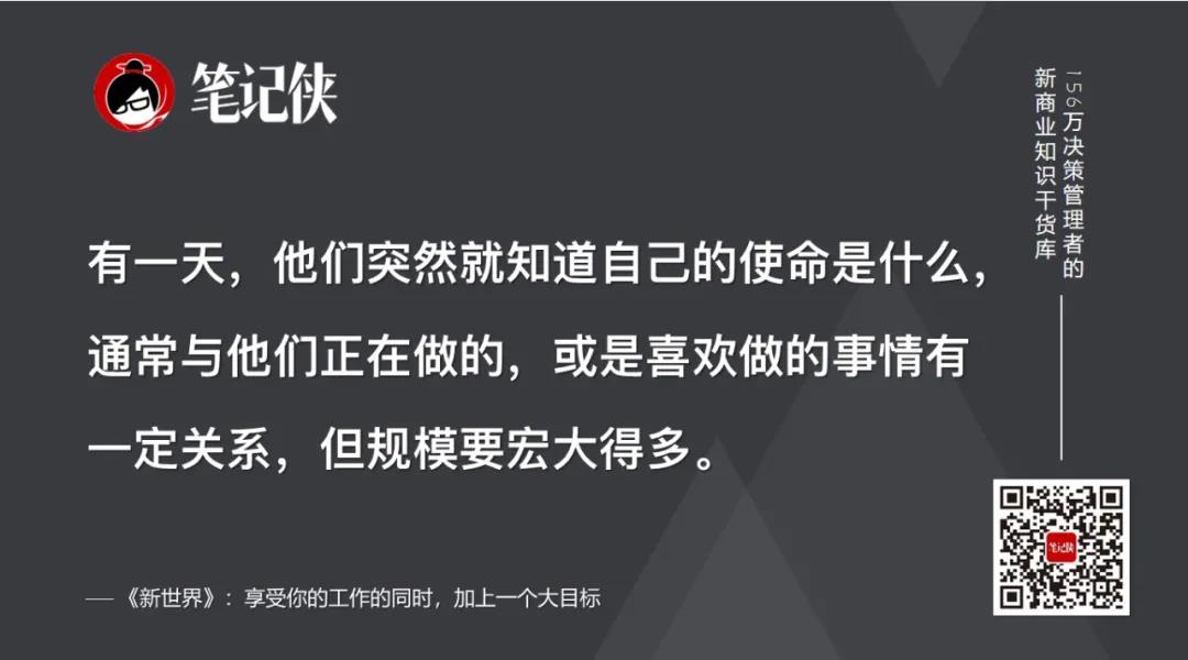 享受你的工作的同時,加上一個大目標。有一天,他們突然就知道自己的使命是什么,通常與他們正在做的,或是喜歡做的事情有一定關系,但規模要宏大得多。