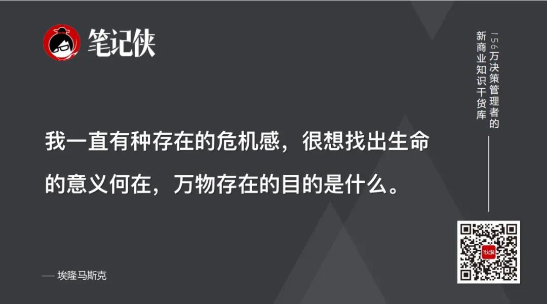 就像喬布斯把全人類產品美學往前推進了二三十年一樣。我們再次回到埃隆·馬斯克身上,他說“我一直有種存在的危機感,很想找出生命的意義何在,萬物存在的目的是什么。”