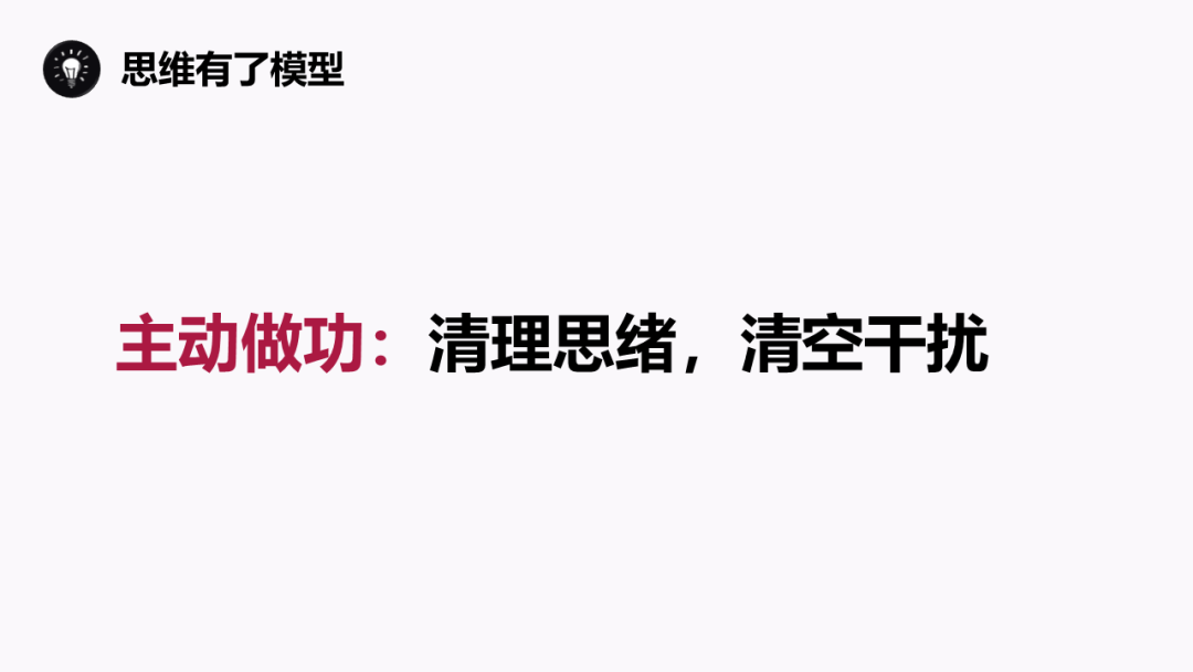 那要怎么辦呢?解決辦法仍然是: 1、主動做功 你不能等到生活脫離了你的掌控,才后知后覺的介入。 你要每天都保持清晰的思緒,主動投入時間和精力,去理清你的情緒,理清你每天所做之事,理清你想要的是什么。 我在未來大學里學到一招,叫做清空干擾。