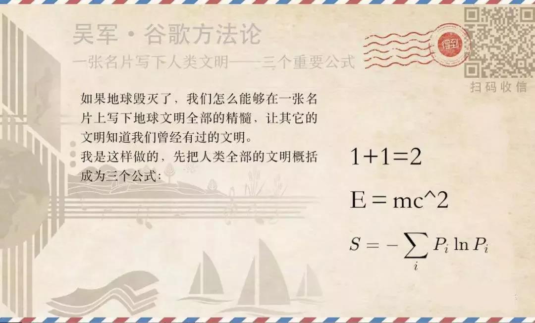 無獨有偶,吳軍也說過類似的話。 如果地球毀滅了,我們怎么能夠在一張名片上寫下地球文明的全部精髓,讓其他文明知道我們曾有過這個文明呢? 吳軍老師給出的答案是三個公式: