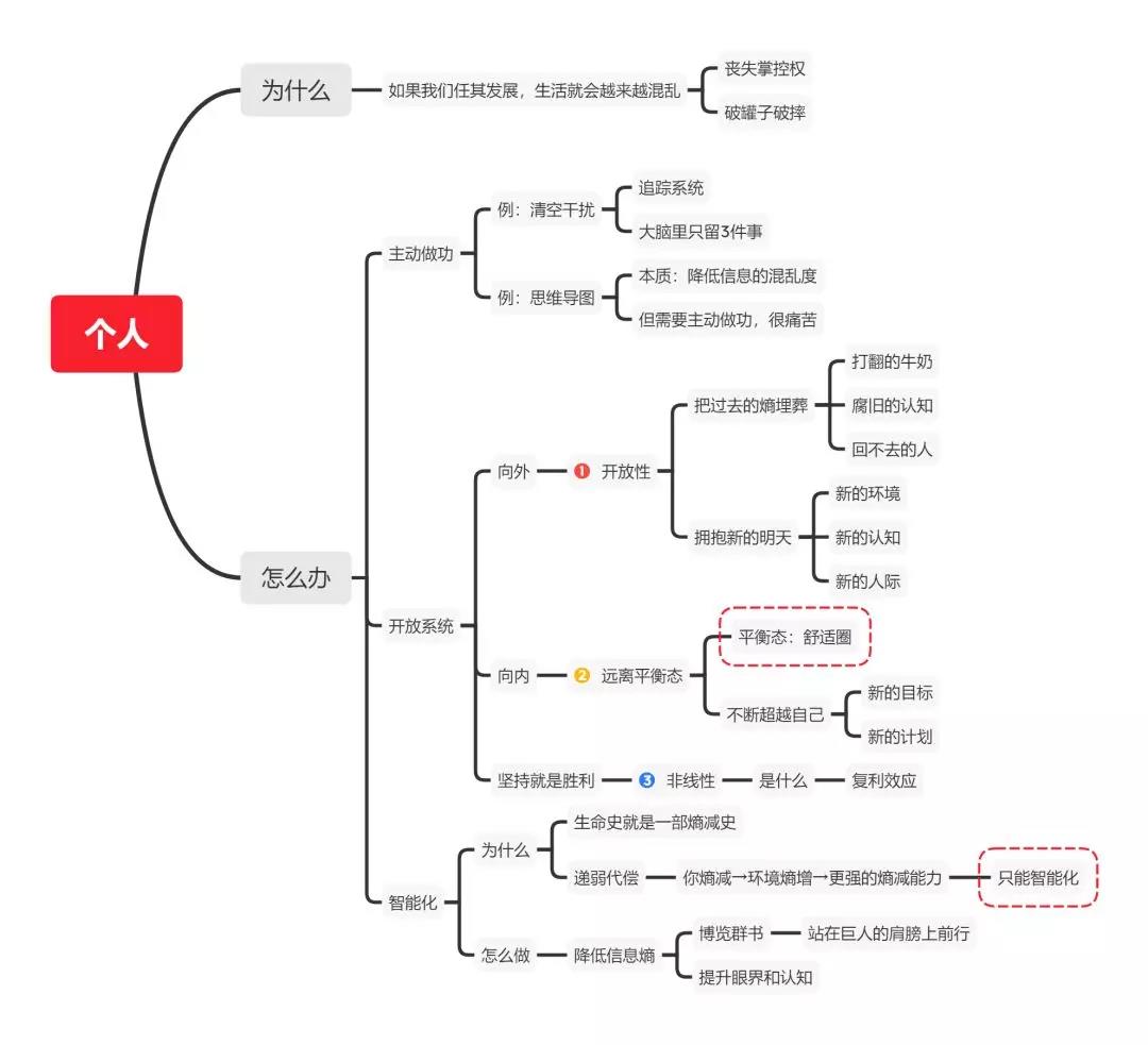 再比如學習這件事,當我寫這篇文章時,大腦是一片漿糊,怎么辦呢? 畫思維導圖,思維導圖的第一性原理就是降低信息的混亂度。 但是這個過程真的極其痛苦,我需要不斷對信息進行分類歸納,有的地方要反復改。