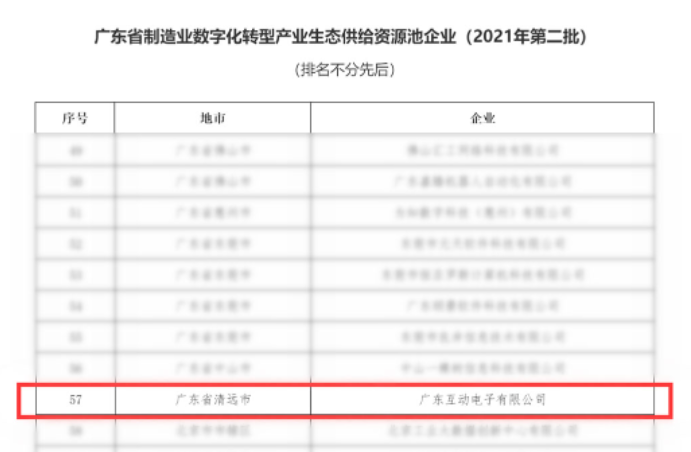 近日,廣東省制造業(yè)數(shù)字化轉(zhuǎn)型產(chǎn)業(yè)生態(tài)供給資源池企業(yè)(2021年第二批)評審結(jié)果公示,廣東互動電子有限公司憑借出色的產(chǎn)品技術(shù)、優(yōu)秀的服務(wù)案例成功入選。